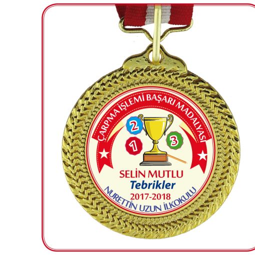 İlkokul 1.sınıf ve 2.sınıflarda okuyan öğrencilerin başarılarını ödüllendirmek için tasarlanmış Çarpmayı Öğrendim Başarı madalyası.Madalya başlıkları isteğe göre"Çarpma Öğrendim Madalyası" veya "Çarpım Tablosunu Okumayı Öğrendim " şeklinde de tasarlanmaktadır.